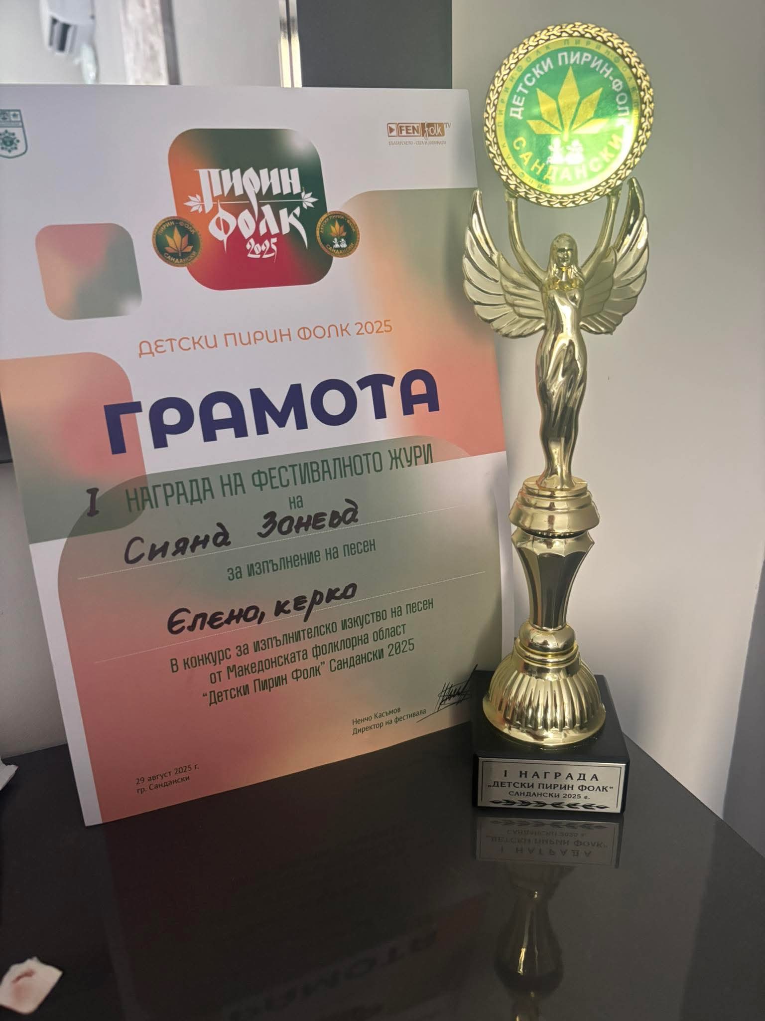 Сияна Зонева от Музикална школа „Карловойс“ при Военен клуб – Карлово се завърна с голямата награда – победител в Детски Пирин Фолк 2025 г., състоял се на 29 и 30 август в град Сандански. Тя се представи с песента „Елено, Керко“, музика и текст – народни, аранжимент – Сашко Велков.
